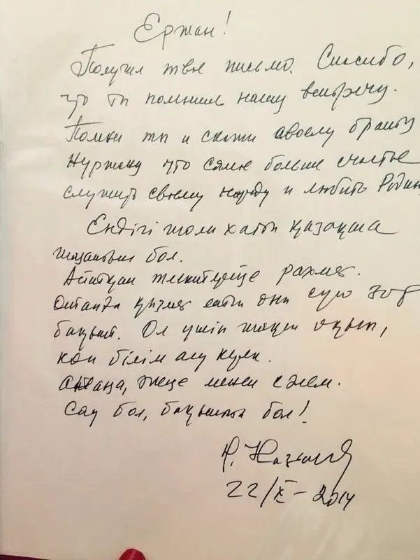 ەرجانعا قايتارعان جاۋاپ حاتىنىڭ سوڭىندا ەلباسى تىلەكتەرىن بىلاي دەپ جازعان بولاتىن: «...ەندىگى جولى حاتتى قازاقشا جازاتىن بول. ايتقان تىلەكتەرىڭە راحمەت. وتانعا قىزمەت ەتۋ، ونى ءسۇيۋ زور باقىت. ول ءۇشىن جاقسى وقىپ، كوپ ءبىلىم ال. اناڭا، اكەڭە مەنەن سالەم. ساۋ بول، باقىتتى بول!».