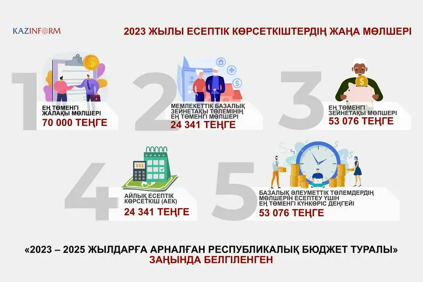 2023 -جىلدىڭ 1-قاڭتارىنان باستاپ كۇشىنە ەنەتىن «2023-2025 -جىلدارعا ارنالعان رەسپۋبليكالىق بيۋدجەت تۋرالى» زاڭ قازاقستان رەسپۋبليكاسىنىڭ مەملەكەتتىك جاستار ساياساتى جانە الەۋمەتتىك قامسىزداندىرۋ سالاسىنداعى زاڭنامانى جەتىلدىرۋگە باعىتتالعان. زاڭ اياسىندا بالا كۇتىمى بويىنشا جاردەماقى تولەۋ مەرزىمىن 1,5 جاسقا دەيىن ۇلعايتۋ، بازالىق زەينەتاقى مولشەرىن كەزەڭ- كەزەڭىمەن كوتەرۋ، ورتاق زەينەتاقى مولشەرىن ەسەپتەۋ كەزىندە تابىستىڭ ەڭ جوعارى شەكتەلۋىن 46-ا ە ك- دەن 55 ا ە ك- گە دەيىن ارتتىرۋ، ساقتاندىرىلعان ادامدار ءۇشىن جۇمىسىنان ايىرىلۋ بويىنشا الەۋمەتتىك تولەمدەردىڭ مولشەرىن ورتاشا ايلىق تابىستىڭ %45 نا دەيىن ءوسىرۋ تۇرعىسىندا تۇجىرىمدامالىق تۇزەتۋلەر قامتىلعان. زاڭعا سايكەس، ەلىمىزدەگى ەڭ تومەنگى جالاقى مولشەرى 70 مىڭ تەڭگە بولىپ بەكىتىلدى. ايلىق ەسەپتىك كورسەتكىش (جاردەماقىلاردى جانە باسقا دا الەۋمەتتىك تولەمدەردى ەسەپتەۋ، سونداي- اق سالىقتاردى جانە باسقا دا تولەمدەردى قولدانۋ ءۇشىن) 3450 تەڭگەنى قۇرايدى. ەڭ تومەنگى كۇنكورىس مولشەرى 40567 تەڭگە بولادى.