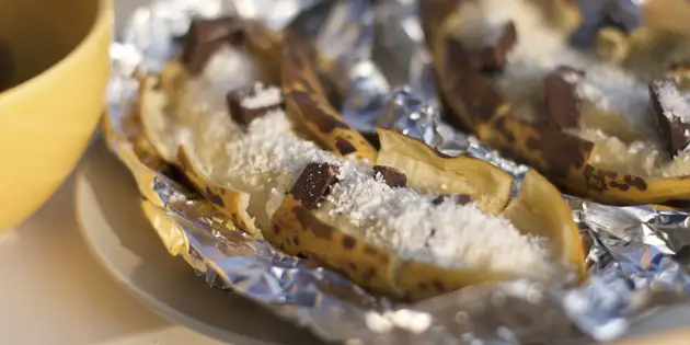 ءبىر ءىرى باناندى تازالاپ، ورتاسىن ازداپ الىپ، كولدەنەڭنەن كەسىڭىز. ونى مارشمەللوۋمەن تولتىرىپ، ۇگىتىلگەن شوكولاد پەن ءدام قابىق قوسىپ، بال قۇيىڭىز. باناندى فولگامەن وراپ، الدىن الا 200 گرادۋسقا دەيىن قىزدىرىلعان پەشكە 5 مينۋتقا قويىپ الىڭىز.