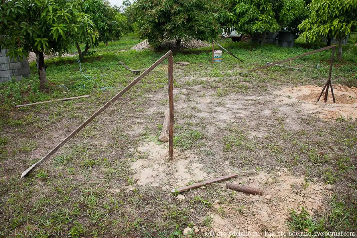 ەندى ءۇيدىڭ قالاي تۇرعىزىلعانىن ەگجەي-تەگجەيلى باياندايىق. مانگو اعاشتارى وتىرعىزىلماعان ۋچاسكەگە باعان قادالىپ، ونىڭ ۇشىنا تاعى ءبىر اعاش جالعانادى دا، توڭىرەك سيركۋل ءتارىزدى سىزىلادى. وسىلايشا بولمەنىڭ اۋماعى انىقتالدى.