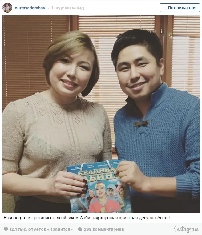 «كەلينكا سابينكا» فيلمدەگى باستى ءرولدى سومداعان اكتەر نۇرتاس ادامبايەۆتىڭ سابينا كەيىپكەرىنە ۇقسايتىن اسەل بودامبايەۆا.