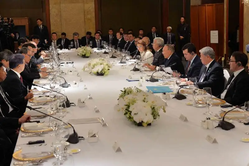 قاۋىرت جۇمىستارىنىڭ كوپتىگىنە قاراماستان كەزدەسۋگە ۋاقىت تاپقان بيزنەس وكىلدەرىنە شىنايى ريزاشىلىعىن بىلدىرگەن ق ر پرەزيدەنتى: «كورەيا رەسپۋبليكاسى شىعىس ازياداعى قازاقستاننىڭ باستى سەرىكتەستەرىنىڭ ءبىرىن سانالادى. ءبىزدىڭ تاۋەلسىزدىگىمىزدىڭ 25 جىلى بويى كورەي ەلىنىڭ دامۋ تاجىريبەسىن، ەكونوميكانى دامىتۋ جولىن تىڭعىلىقتى زەردەلەۋگە باسا نازار اۋدارىپ كەلەمىز. تاۋەلسىزدىك جىلدارى ىشىندە كورەيادان قازاقستانعا كەلگەن تىكەلەي ينۆەستيتسيا كولەمى شامامەن ون ميلليارد ا ق ش دوللارىنا جۋىقتادى. ءوزارا تاۋار اينالىمى كولەمى 1,5 ميلليارد دوللاردى قۇرادى»، - دەدى.