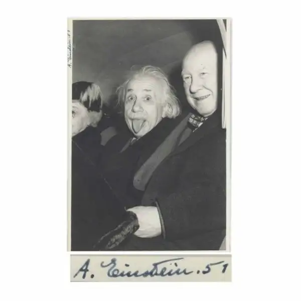 ساتىپ العان ادامنىڭ اتى قۇپيا ساقتالادى. اتالعان فوتوسۋرەتتى ارتۋر ساسسە 1951 -جىلى 14 -ناۋرىزدا عالىمنىڭ 72 جاسىن تويلاعان كەشتە جاساعان ەكەن. پرينستون كلۋبىندا وتكەن شارادا فوتوگرافتارعا قاراپ جىميا بەرۋدەن شارشاعان ەينشتەين ساسسەنىڭ وتىنىشىنە ءتىلىن شىعارعان ەكەن. UPI (United Press International) رەداكتورلارى العاشىندا بۇل سۋرەتتى باسپادان شىعارعىسى كەلمەگەن، دەگەنمەن، قازىر بۇل عالىمنىڭ ەڭ اتاقتى پورترەتى.