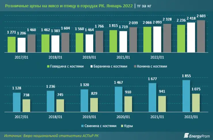 2022 -جىلعى قاڭتاردىڭ اياعىندا قازاقستاندا سۇيەكتى سيىر ەتى بولشەك ساۋدادا كەلىسىنە 2236 تەڭگەگە، قوي ەتى 2418 تەڭگەگە، جىلقى ەتى 2603 تەڭگەگە قىمباتتاعان. تاۋىق ەتىنىڭ كەلىسى 1075 تەڭگە.