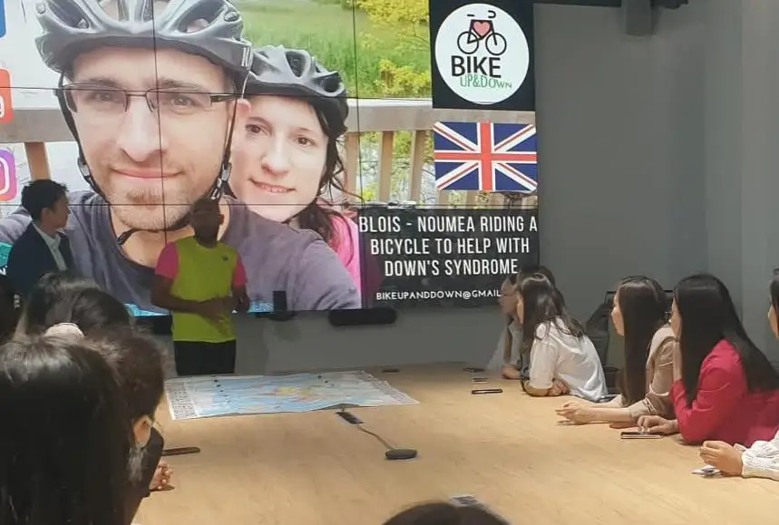 ساياحاتشى جۇپ 2022 -جىلى 29- ساۋىردە گرۋزيادان ازەربايجانعا، ال 7- مامىردا باكۋگە جەتىپ، 25- مامىردا اقتاۋعا كەلگەن. اقتاۋدا فرانسۋز ساياحاتشىلارى نازاربايەۆ زياتكەرلىك مەكتەبىنىڭ وقۋشىلارى مەن ش. ەسەنوۆ اتىنداعى ۋنيۆەرسيتەتىنە ءوز جوبالارىن ۇسىندى. ءوز تانىستىرىلىمىندا ەميلي مەن دەۆيد داۋن سيندرومىن عانا ەمەس، ەستۋ جانە تىرەك- قيمىل اپپاراتىنىڭ بۇزىلۋى ماسەلەلەرىن دە قوزعاپ ءوتتى.