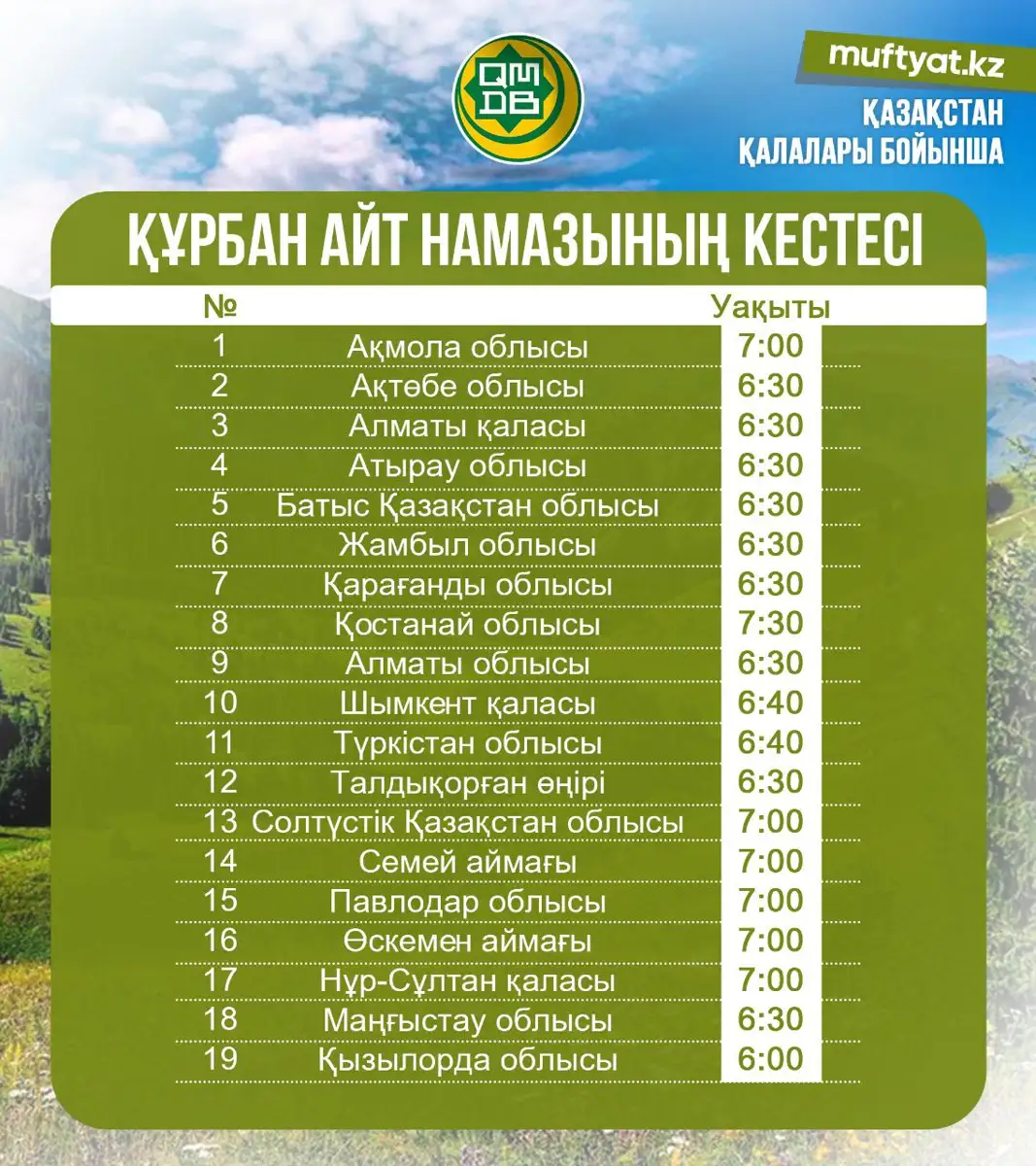 ق م د ب وسى كۇنى وقىلاتىن قۇربان ايت نامازىنىڭ ەلىمىز بويىنشا ازىرلەنگەن كەستەسىن جاريالادى.