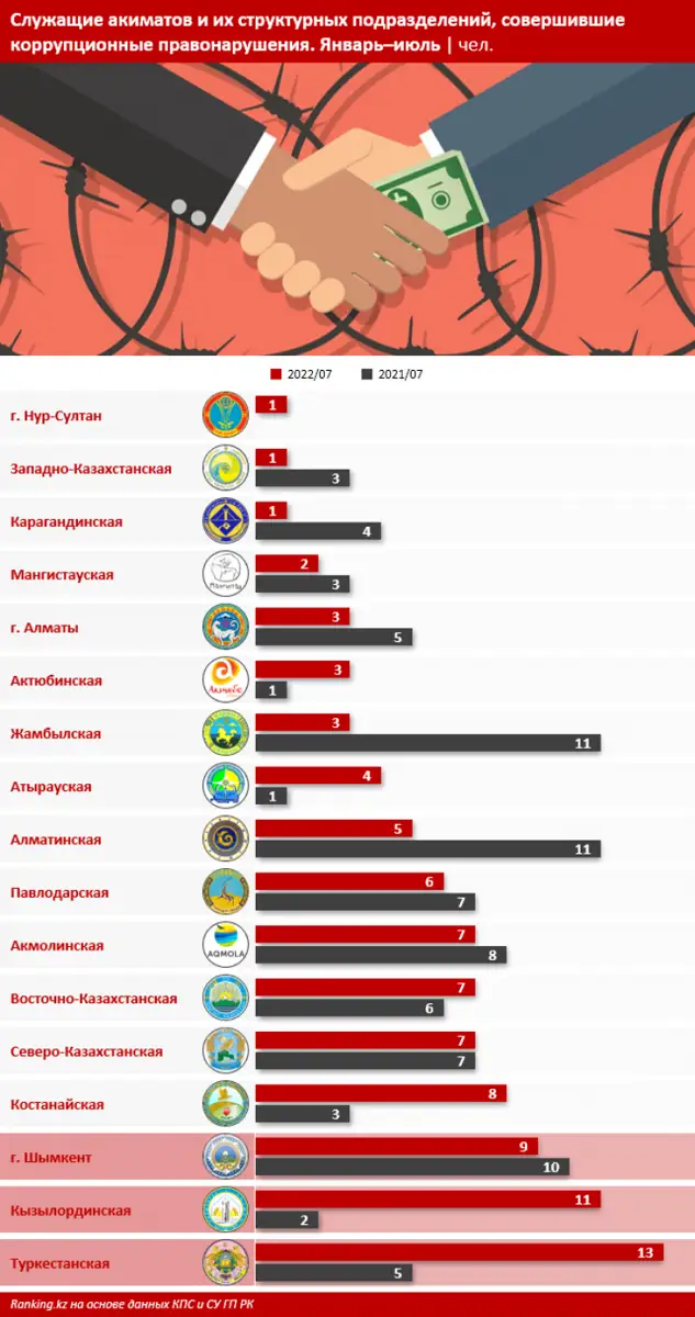 ءبىرىنشى جارتىجىلدىقتا مۇنداي قۇقىق بۇزۋعا اكىمدىكتەر مەن ولاردىڭ قۇرىلىمدىق بولىمشەلەرىنىڭ 91 قىزمەتكەرى جول بەرگەن. بۇل كەيىنگى جىلدارداعى رەكورد كورسەتكىش. ماسەلەن، 2021-جىلدىڭ ءدال وسى كەزەڭىندە 87 جەمقور شەنەۋنىك ۇستالعان.