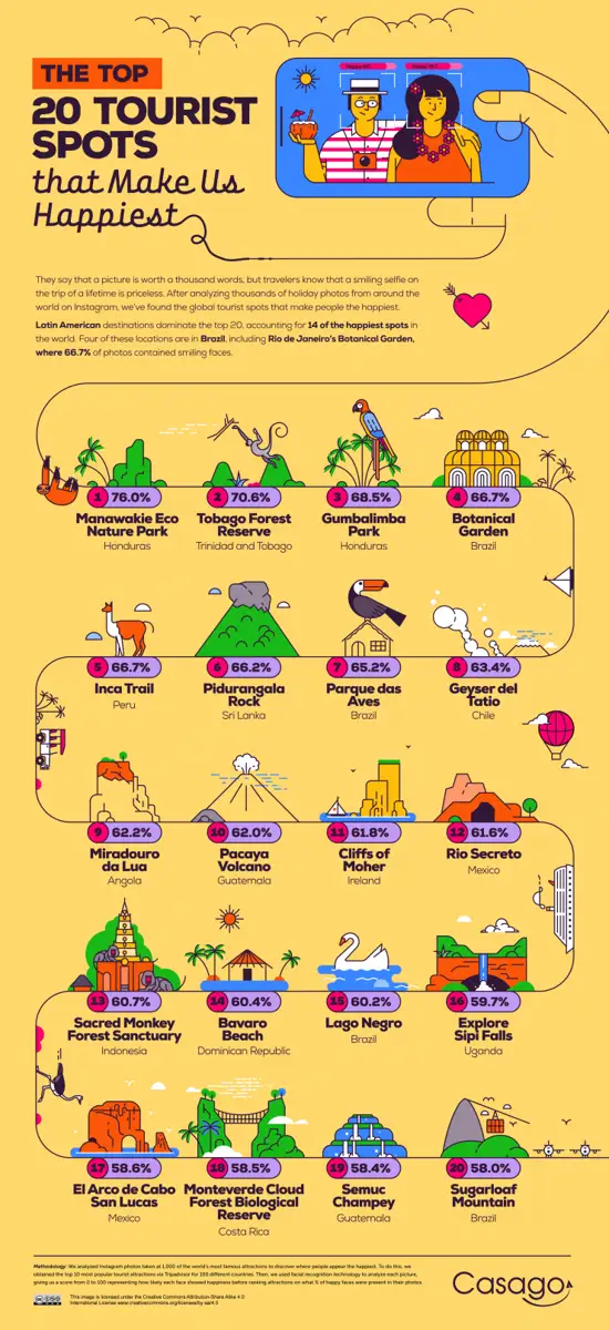 الەمنىڭ 100 ەلىندەگى ءتۇرلى كورنەكى ورىنداردىڭ مىڭداعان سۋرەتتەرىن سارالاي كەلە زەرتتەۋشىلەر «باقىت يندەكسىن» انىقتادى دەۋگە بولادى.